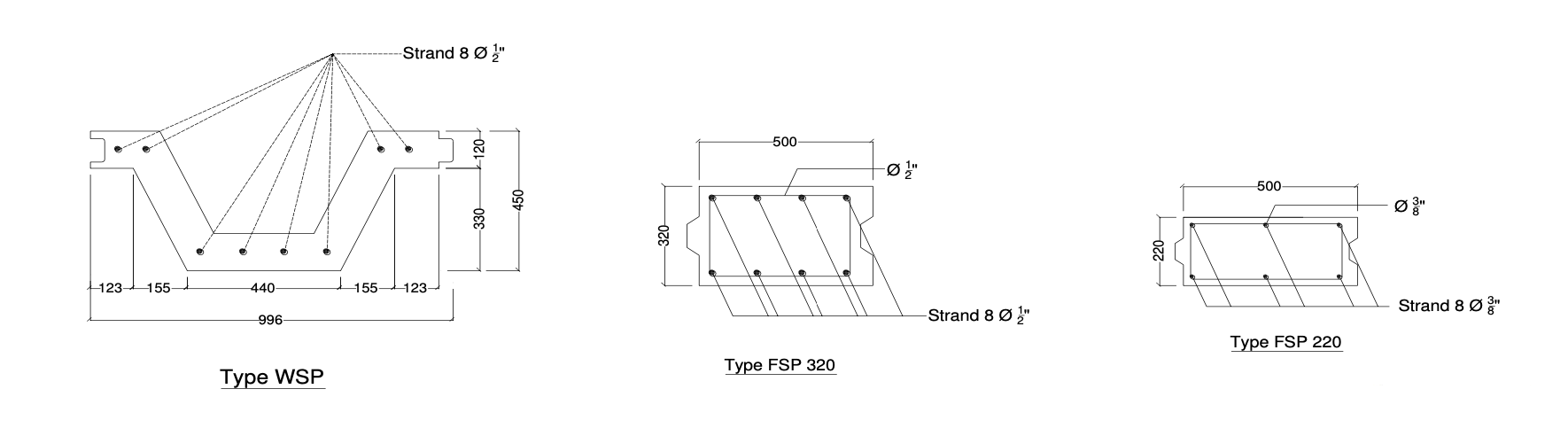 | WSP 450x1000 | 8 strand ∅ 1/2" | 450 | 120 | 996 | 26,9 | 454 |